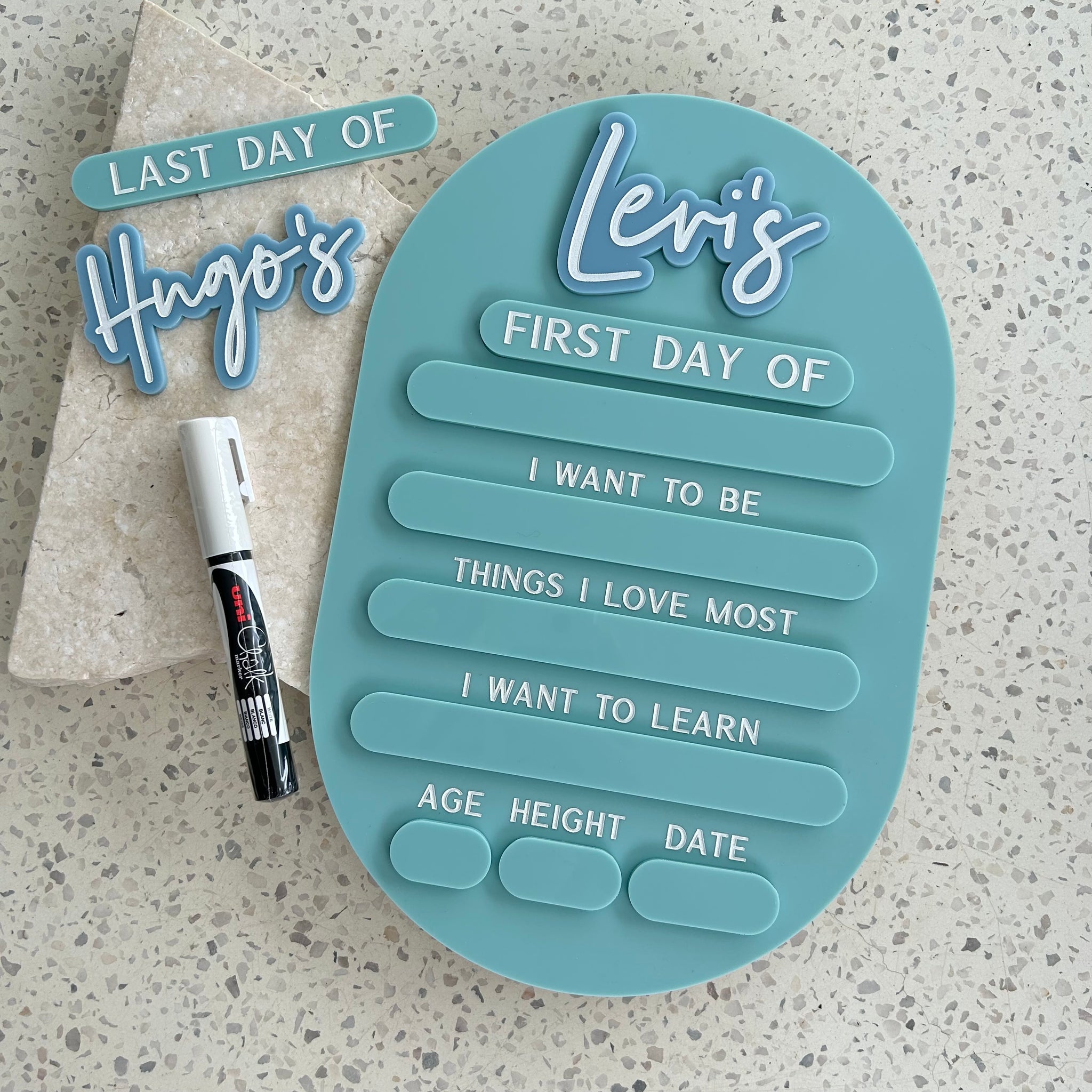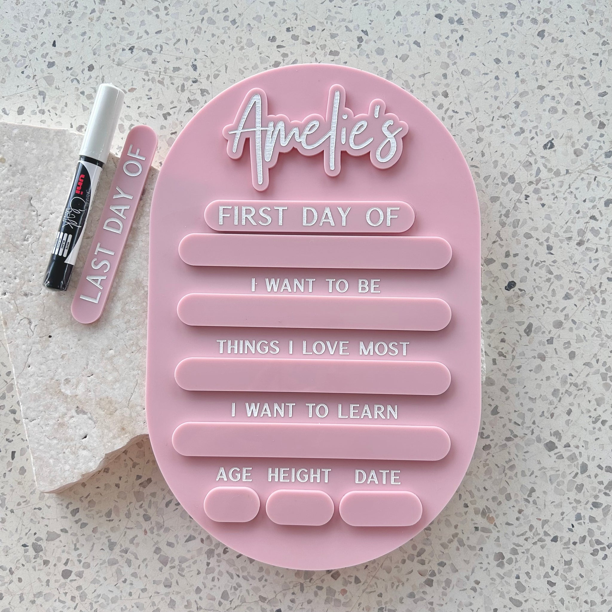 Includes: White liquid chalk marker to write with + both first and last day interchangeable plaques